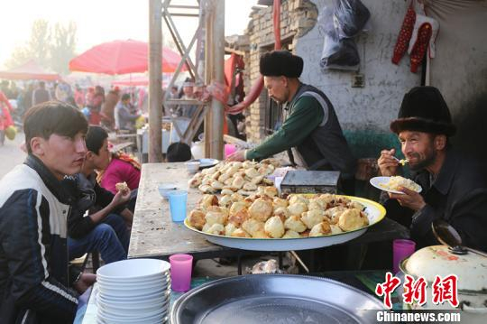 中新网莎车11月19日电 (记者 朱景朝)每逢周四和周日,家住莎车县荒地镇的依提·阿吾提带着20个帮工,北京时间8时就要赶到30公里外的县城城郊大利贸易市场,架炉支锅,开始一天忙碌的餐饮服务。