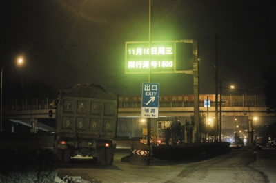 11月19日,北京城南二环永定门桥,路灯下罩着一层灰纱,空气质量实时监测显示“轻度污染”。