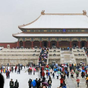 2015年11月22日,农历小雪节气,北京迎来强降雪,游人不畏大雪,故宫排队购票,一赏紫禁城雪景。 图片来源:视觉中国