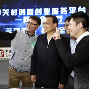 图为国务院总理李克强在北京出席首届“全国大众创业万众创新活动周”,并考察主题展区与创业者合影。