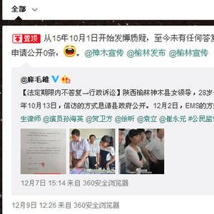 12月9日,网友@麻毛雄 发布消息称, 他从今年10月1日开始发微博希望申请公开神木县副县长刘亚萍的简历,至今未有任何答复。