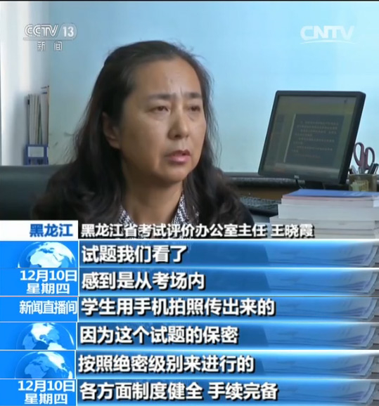 黑龙江省考试评价办公室主任王晓霞:试题传出当天,我们做了初步判断,认为是考场内学生用手机拍照传出来的。