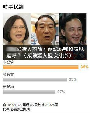 2015年12月27日首场“总统”候选人电视辩论结束,Yahoo奇摩随即展开网络民调。经过7天的投票,最终结果显示,朱立伦在辩论会的表现获得39%网友的认同,微幅领先蔡英文33%,而宋楚瑜获得27%的网友支持。