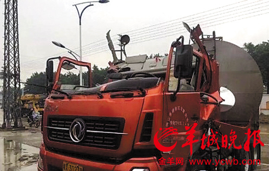 油罐车被剃头 佛山一龙门架设置存安全隐患