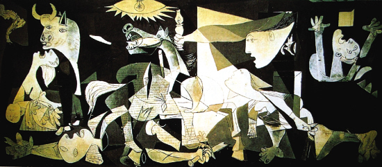 尽管巴勃罗·毕加索的《格尔尼卡)是接受西班牙共和国流亡政府的再三邀约、为了在巴黎的世界博览会上展出而创作,但这幅抨击西班牙法西斯政权的画作依然体现了画家强烈的正义激情。西班牙内战期间,德国于1937年对西班牙北部巴斯克地区首府格尔尼卡进行地毯式轰炸。这幅画对此惨剧进行描绘,并成为控诉战争暴行的一个普遍象征。画作的强大力量部分是缘于其将历史史诗元素与抽象的图像形式相结合。此外,毕加索决意不采用任何彩色,让画面传达出—种新闻纪实般的强烈可信度。