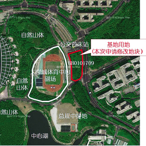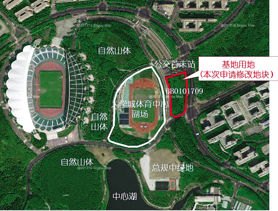 为确保大学城绿地面积不减少,本次修改方案拟将其与基地用地进行绿地等面积置换。拟用于置换绿地的地块位于大学城体育中心副场西南角,现状为山坡,规划为体育用地,市体育局计划按现状予以保留,不作建设。本次修改方案拟将其与基地用地进行绿地等面积置换,面积6749平方米。