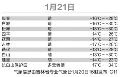 新文化记者从长春市气象台了解到,1月14日以来长春市气温持续偏低,14日~19日全市平均气温为-20.5℃,比常年-16.4℃低4.4℃。受强冷空气影响,预计1月21日~24日,长春市气温将进一步下降,北部县市将出现严寒天气。其中长春南部最低气温一般为-27℃~-30℃,北部县市最低气温一般为-32℃~-34℃。预计25日(下周一)开始长春市气温将明显回升。