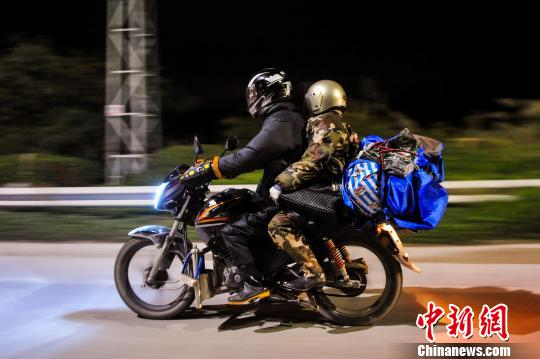 图为在粤广西籍务工人员夜骑摩托车在寒风中返乡。 黄威铭 摄