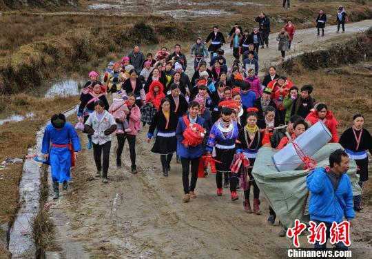 90后的贵州苗族小伙陈志良按照当地苗族的传统婚俗,除夕日迎娶新娘吴永云,为此他放弃了很多年轻人钟爱的新式婚礼。陈志良告诉记者,这是我们要坚持的传统。