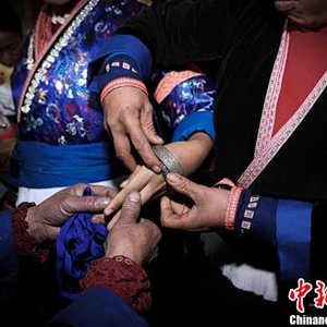 图为至亲帮新娘佩戴银饰。 张晖 摄