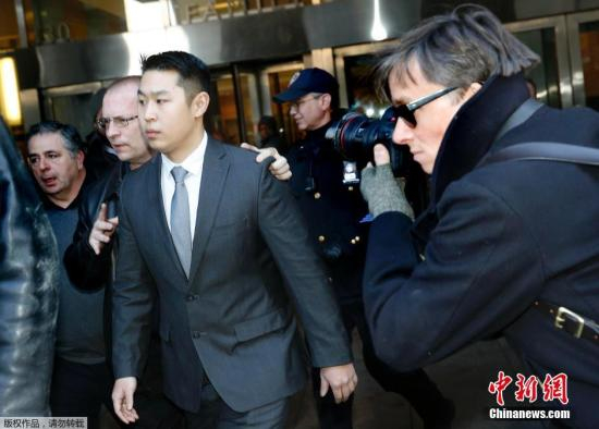 资料图:当地时间2015年2月11日,美国纽约,2014年11月枪杀一名手无寸铁非裔青年的华裔警察梁彼得(Peter Liang)被起诉后被法院传讯。2014年11月20日的深夜,28岁的非裔青年雅佳·格雷(Akai Gurley)和女友在布鲁克林一间公寓漆黑的楼梯间与华裔警察梁彼得遭遇,最终手无寸铁的格雷被梁彼得枪杀。