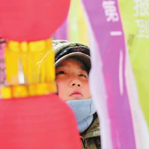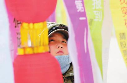 昨日,在长春市工人文化宫门前,一位小朋友在很认真地猜灯谜 新文化记者 孙立国 摄