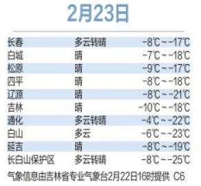 今天,我省大部分地区开始放晴,吉林地区东部、通化、白山、延边地区南部、长白山保护区有小雪。今天白天,我省大部分地区有3~4级偏北风。24日夜间到25日白天,全省多云有时晴,吉林地区东部、通化、白山、长白山保护区部分地方有小阵雪。