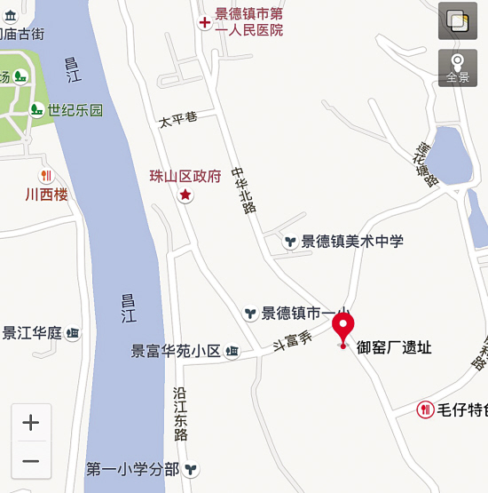 御窑厂遗址位于景德镇最为繁华的珠山区,坐北朝南,邻近一山一河——河是昌江河,景德镇对外运输的主要通道之一;山叫“珠山”,实际是一座小丘陵。