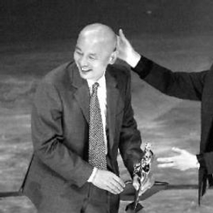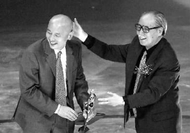 2002年,葛存壮(右)在为葛优颁发百花奖奖杯 新华社 发