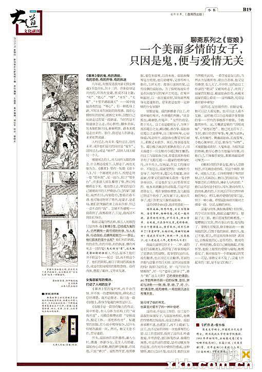 最近读到蔡小容的作品《她从聊斋来》,终于感觉到了踏踏实实的安慰:她的读解似乎处处“着我之色”,却为走进《聊斋志异》提供了一种可能性。听她将篇中故事娓娓道来,“你看,寒门小户的女儿,连梦也做得规规矩矩……”、“这些少年其实说不上恶,他们只是老实地站着看,等阿宝起身……”这种闲言碎语,这种亲切感,我们感觉读的不仅是聊斋,不仅是蒲松龄、蔡小容,还有我们古老的文化、我们眼下的生活。