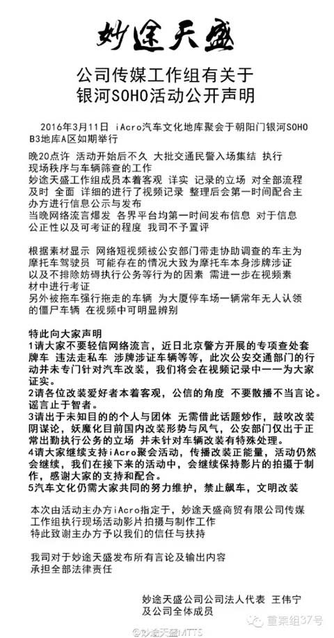 3月12日,参与此次改装车聚会活动的北京妙途天盛商贸有限公司,通过其认证微博发布了对改装车聚会活动的声明。希望“大家继续支持iAcro聚会活动”“禁止飙车,文明改装”等: