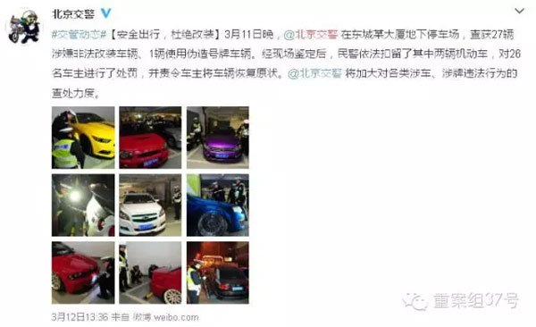 重案组37号(微信ID:zhonganzu37)探员了解到,当天晚上,北京市交管局在北京银河SOHO附近区域查处套牌车辆,在检查到银河SOHO停车场时,“偶遇”了这场改装车聚会。