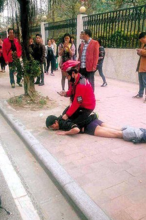 新京报:网上流传较广的一张照片里,你膝盖跪在劫匪身上,一手紧紧抓住其外衣,他手掌摊开平躺在地,但长裤被脱了下来,露出紫色内裤。这是怎么回事?