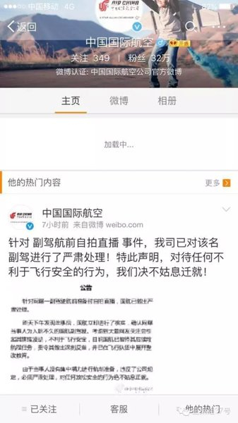 与之相对应的,东家国航也发布了相关公告,表示确认当事人为入职不久的国航副驾驶。考虑到大量网友关注会引起其情绪波动,不利于飞行安全,目前已暂停其后续段航程任务,责令其做出反省,并已在飞行队伍中展开整改教育。