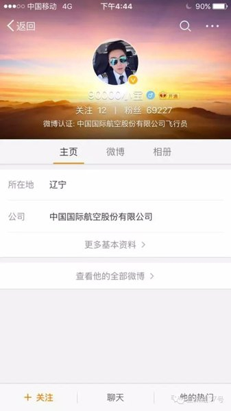 随即多名网友搜索出,该男子的微博名称为@@90000小宝,供职于国航飞行部,3月31日当天曾飞往罗马,被曝光后,国航已派人接替其工作。而在微博上,这也是一个时刻在用照片记录自己生活点滴的耿直boy: