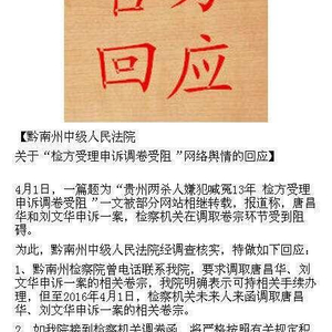 回应中写道:“黔南州中级人民法院经调查核实,做如下回应:一、黔南州检察院曾电话联系我院,要求调查唐昌华、刘文华申诉一案的相关卷宗,我院明确 表示可持相关手续办理,但至2016年4月1日,检察机关未来人来函调取唐昌华、刘文华申诉一案的相关卷宗。二、如我院接到检查机关调卷函,将严格按照有 关规定积极做好支持配合工作。”