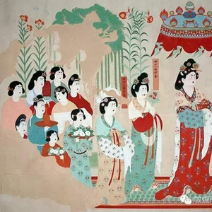 记者梳理发现,敦煌壁画中还囊括有清明时节春游途中设乐踏舞、“顶杆娱乐”和“攀树摘花”等画面,如晚唐第156窟的《宋国夫人出行图》中,背景是柳树成荫、繁花似锦的春天景象,画面中部绘张议潮的夫人宋氏骑一高大的白马,满头花钗,大袖裙衫。