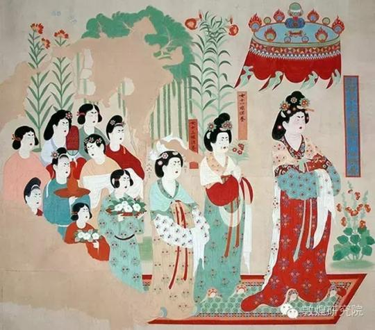 4月3日,敦煌研究院披露一批涉及中国古代清明习俗的壁画和文献。图为莫高窟第130窟-都督夫人礼佛图。 段文杰临摹 摄