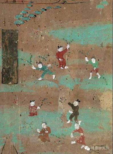 4月3日,敦煌研究院披露一批涉及中国古代清明习俗的壁画和文献。图为莫高窟第112窟-群童采花(中唐)。 敦煌研究院供图 摄