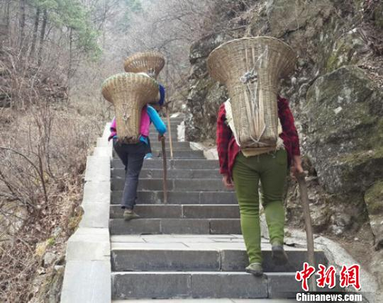 4月6日,在位于八百里伏牛山腹地的洛阳白云山,记者看到,通往海拔2200多米山顶的小道上,几名背山工身背装着石料的大背篓,手拄拐杖,默默拾级而上。行进中,每隔十几分钟,他们便会用拐杖支起背篓休息片刻,再次起步前往往大喝一声,给自己打气。走到陡峭的登山天梯时,每次顶多连续登十几个台阶就要停下来休息。虽然风和日丽,但他们额头上都沁出了汗珠,上衣的胸口和后背也都被汗水浸湿了一大片。