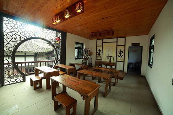 走过寨门,步下石阶,右边“尔雅书院”几个大字便映入眼帘,书院大门两侧挂着一副对联,上联是:衍祖宗一脉真传,克忠克孝;下联为:教子孙两行正路,惟读惟耕。这也是喻茂坚留给后世子孙的“垂训联”。