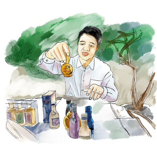 ●在一张铺了丝绒的桌子上,朱述贤展示他收藏的这些新奇特的小酒版,讲述他追酒的经历,这些足够形成一本丰富的画集。