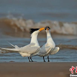 中新网福州4月13日电 (陈雪玲)在闽江口鸥鹭翔集的湿地上,有值得福州人骄傲的“三宝”:中华凤头燕鸥、黑脸琵鹭、勺嘴鹬。这三种鸟都是濒临灭绝的世界濒危鸟类。其中,中华凤头燕鸥是鸥科鸟类中最稀少的一种,在世界鸟类红色名录上被列为极危物种,最新调查数据显示,全球不到100只。近期,福建省观鸟会会员在闽江河口湿地自然保护区发现,今年又有中华凤头燕鸥飞来谈恋爱了。