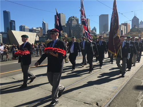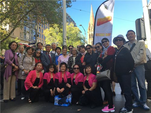 这一天,澳大利亚的每个城市都会有大大小小的游行活动,墨尔本也不例外。4月25日上午9点,墨尔本Anzac游行队伍从Flinders街和Swanston街交叉口开始,沿着St Kilda路一直走到皇家植物园附近的 The Shrine of Remembrance 战争纪念馆,游行队伍的成员有参加过战争的老兵,以及老兵的子女和后代,而在今年的游行队伍当中,有一支由近30位中国大陆籍华人组成的游行队伍吸引了记者的注意,他们都是华人军人们的后代,这其中包括当年参与第二次世界大战的士兵家属,这也是墨尔本地区首次有中国大陆籍华人参与的澳新军团日游行。