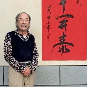 陈德良与他写的一幅字合影,这幅字写着“三羊开泰”