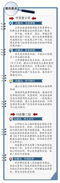 调 查组对百度公司提出了整改要求。立即全面清理整顿医疗类等事关人民群众生命健康安全的商业推广服务。即日起,对医疗、药品、保健品等相关商业推广活动,进 行全面清理整顿,对违规信息一经发现立即下线,对未获得主管部门批准资质的医疗机构不得进行商业推广;改变竞价排名机制,不能仅以给钱多少作为排位标准。 立即调整相关技术系统,在2016年5月31日前,提出以信誉度为主要权重的排名算法并落实到位;对商业推广信息逐条加注醒目标识,并予以风险提示;严格 限制商业推广信息比例,每页面不得超过30%;建立完善先行赔付等网民权益保障机制。畅通网民监督举报渠道,提高对网民举报的受理、处置效率;对违法违规 信息及侵害网民权益行为,一经发现立即终止服务;建立完善相关机制,对网民因受商业推广信息误导而造成的损失予以先行赔付。