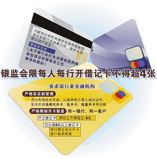 银监会今年3月中发布消息称,为全力配合公安机关做好电信网络新型违法犯罪打击治理工作,要求银行业严格实行实名制管理,严格限制开卡数量。对已办理4张以上借记卡的客户,银行业金融机构要主动与开卡客户联系核查,经核查发现非本人意愿办理的,应当中止服务,业界俗称为“限卡令”。