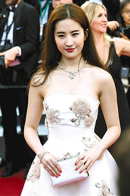 同样是该品牌代言人的李冰冰则是第二位走上红地毯的中国女明星,她穿黑白搭配的裙子,背后的设计非常别致,梳着赫本式的发型,走的是优雅风,也获得了直播的两个镜头。这两个镜头都是面部大特写,可以清晰地看见冰冰的耳环是棕榈树叶下面坠着一颗珍珠。众所周知,戛纳电影节的LOGO正是棕榈树叶。“神仙姐姐”刘亦菲穿粉红色裙子,长发披肩,很温婉的样子。这是她第一次走戛纳电影节的红毯。
