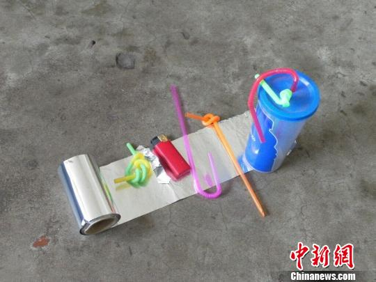 民警打开犯罪嫌疑人的背包时,看到了一个用塑料杯改装的“冰壶”和一卷锡纸。 陈伟 摄
