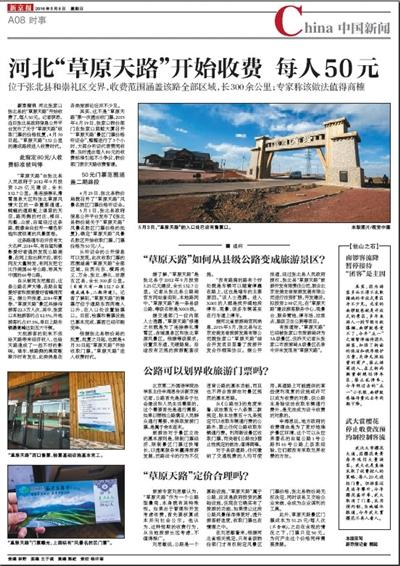 为何对公路进行收费?50元的定价是否合理?5月8日,《新京报》刊登了《张家口“草原天路”全区域收费每人50》一文,首次提出对收费合理性的质疑。随后又连续四篇报道追踪。“草原天路”每人50元一张的门票该不该收,成为社会关注热点。