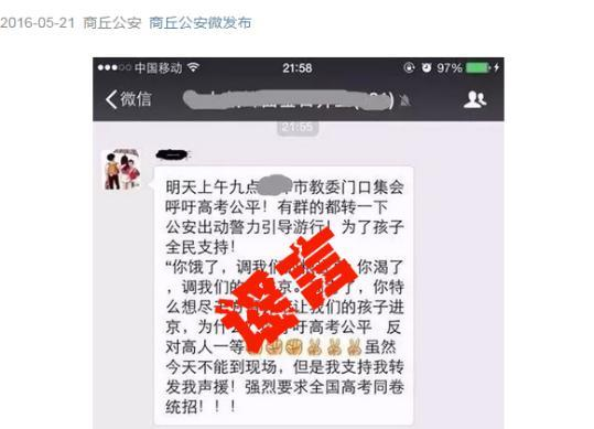 21日上午开始,郑州、商丘、焦作等多地网民在微信、微博和百度贴吧传播带有“明天上午九点在市教委门口集会呼吁高考公平,公安出动警力引导游行”等字样的信息,引发关注。大河报·大河客户端编辑获知后,立即求证。据查,商丘、焦作等地警方均在官微进行了辟谣,此系谣言,请不要传播。