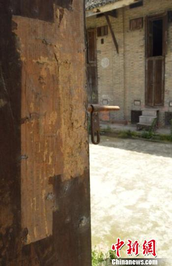 粘贴在仓门上的旧报纸。 廖雪芝 摄