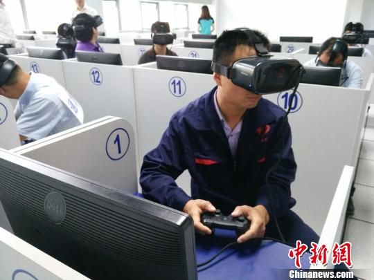 比赛选手佩戴VR(虚拟现实)头盔进行虚拟的电梯维保作业操作。 钟升 摄