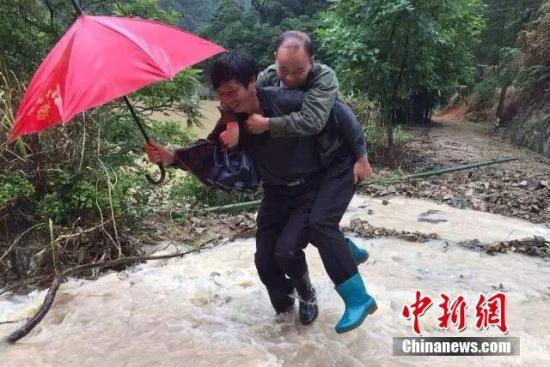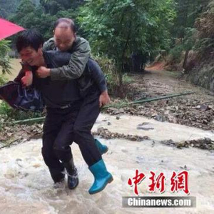 6月18日,受强降雨影响,福建政和县城区不同程度出现内涝,市政设施受损,影响群众生产生活。据南平市防汛办披露,6月17日至18日7时,南平市普降暴雨,部分大暴雨,其中顺昌、建瓯、政和、邵武、建阳、延平6个县(市、区)共有67个自动站出现100毫米以上降水。图为政和县岭腰坑村干部转移群众。 郑时 摄