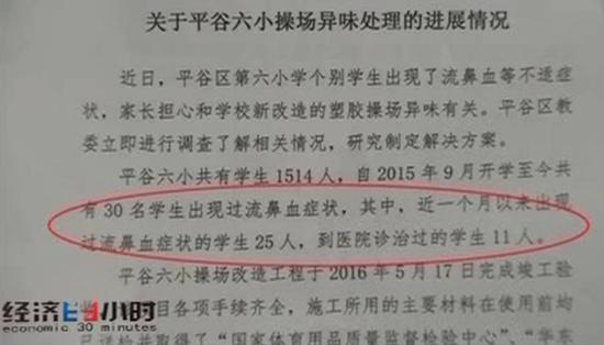 北京平谷区第六小学的校园改造工程,是在2015年10月26日完成招标的,2016年5月工程完工,塑胶跑道铺设面积1700平方米,从完工到使用,不到10天,学校里就出现部分学生不同程度的流鼻血、过敏、头晕、恶心等症状。