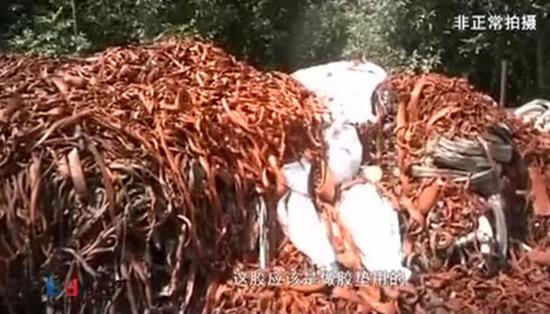 张老板把记者带进了眼前的这个普通的农村庭院,走进大门,废弃轮胎、废弃电缆、还有一些叫不上名字的橡胶制品交织在一起,堆起了一座座小山。张老板告诉记者:就是这些垃圾橡胶制品,打成黑颗粒,就成了跑道最底下的那层配色了。
