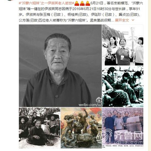齐鲁网临沂6月22日讯 今天上午@蒙阴发布对外发出讣告称:6月21日,著名支前模范、“沂蒙六姐妹”唯一健在的伊淑英同志因病于2016年6月21日16时30分与世长辞,享年91岁。伊淑英与张玉梅(已故)、杨桂英(已故)、伊廷珍(已故)、冀贞兰(已故)、公方莲(已故)五位老人被尊称为“沂蒙六姐妹”。孟良崮战役期间,六姐妹组织村中妇女积极支前,为祖国的解放事业做出了重要贡献。英雄已去,精神永存。向支前模范致敬,不忘沂蒙六姐妹,不忘沂蒙精神。