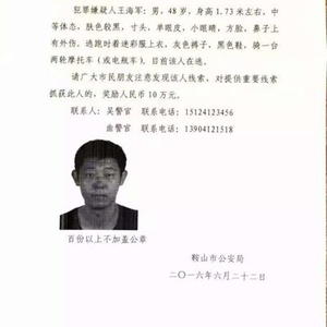 警方悬赏通报称,嫌疑人王海军,辽宁省海城市东四街道红旗村人,男,48岁,身高1.73米左右,中等体态,肤色较黑,寸头、单眼皮、小眼睛, 方脸,鼻子上有外伤,逃跑时着迷彩服上衣,灰色裤子,黑色鞋,骑一辆两轮摩托车(或电瓶车)。对提供重要线索抓获此人的,奖励人民币10万元。
