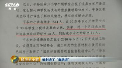 2016年6月14日,央视财经《经济半小时》记者在北京市平谷区第六小学看到,学校刚刚完成了塑胶跑道的铺设工程。校方的定标公告日期显示是 2015年的10月26日,工程完工日期大概在2016年的5月17日。6月1日,学校的塑胶跑道正式投入使用。但过了不到一个星期的时间,在6月6日的 时候,这所学校的部分学生就出现了流鼻血头晕恶心的症状。