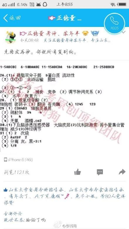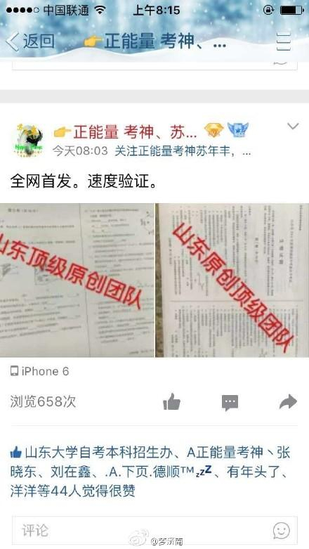 根 据安排,26日上午的考试科目为生物和化学,下午为思想政治。当天,济南一位网络大V接到网友私信称,“(6月26日)上午化学10:30开 考,11:00就在QQ空间公布答案了,下午思想政治考试20分钟答案公布完毕了!”随后,该大V将此消息通过微博发布,并配有多张图片。